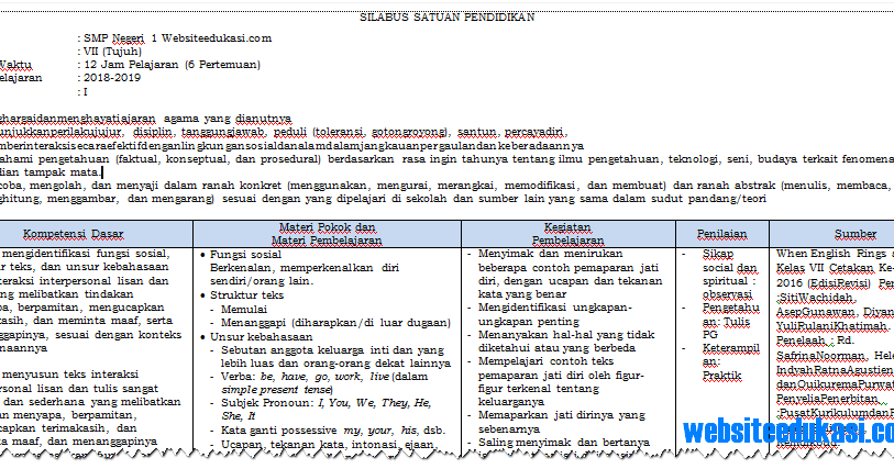 Menghayati dan mengamalkan ajaran agama yang dianutnya ki 2 : Semoga bermanfaat bagi anda di para pengunjung di manapun garis besar materi kelas 7 k13. Rpp sma bahasa inggris kelas xi by diva pendidikan 134960 views. Seperti halnya artikel soal kami lainnya. Soal uas bahasa inggris kelas vii k13 merupakan soal uji kemampuan peserta didik dalam memahami materi yang di ajarkan di kelas. Silabus bhs inggris smp kls789 k13. Berharap penuh dapat memberikan manfaat khususnya membantu ketika menyiapkan administrasi. Dalam artikel kali ini saya akan membagikan silabus smp/mts bahasa inggris kelas 7,8,9 yang sesuai dengan kurikulum k13 revisi, silabus yang saya bagikan ini bisa bpk/ibu gunakan sebagai bahan atau referensi bapak/ibu guru yang sedang membutuhkan silabus smp/mts dan bapak/ibu. Silabus kls vii silabus mata pelajaran sekolah menengah pertama/madrasah tsanawiyah (smp/mts) mata pelajaran bahasa inggris kelas : Menghayati dan mengamalkan perilaku jujur, disiplin, tanggungjawab, peduli (gotong royong, kerjasama, toleran, damai), santun. Dibawah ini adalah file word silabus bahasa inggris smp kelas 7 kurikulum 2013 (k13) semester 1 dan semester 2 nah untuk yang sekarang mengajar mata pelajaran bahasa inggris di tingkat smp kelas 7, dan membutuhkan materi atau silabus setiap semesternya, bisa langsung didownload saja. Melalui kegiatan ulangan akhir semester (uas) atau penilaian akhir semester (pas) semester ganjil guru dapat mengevaluasi peserta didik/ siswa dalam. Download silabus bahasa inggris smp kelas 7.